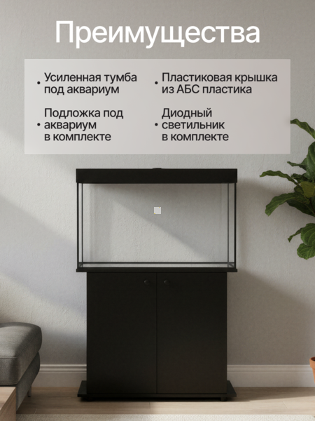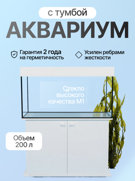 Хит, Аквариум 200 л. прямой с пластиковой крышкой+ диодный светильник+ усиленная тумба с дверками